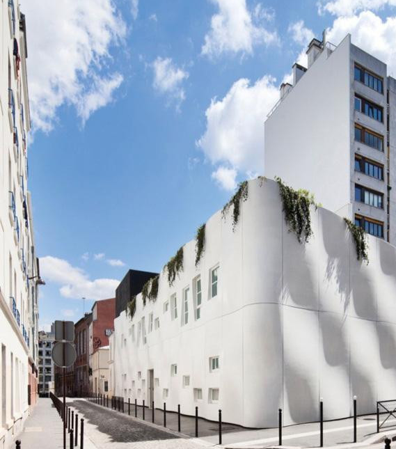 這是由法國事務所ECDM設計的一個托兒所項目,它呈現出起伏的混凝土墻壁,這種漣漪的效果是通過采用一系列的預制板面形成的,它們環繞建筑的三側,只有一側包含開口的窗戶。一個院落位于兩層樓的中心,周圍環繞為孩子們準備的房間,可以容納66名孩童。一個樹形的金屬傘遮擋結構為院落提供遮陰,從街道看去好似漂浮在屋頂之上。